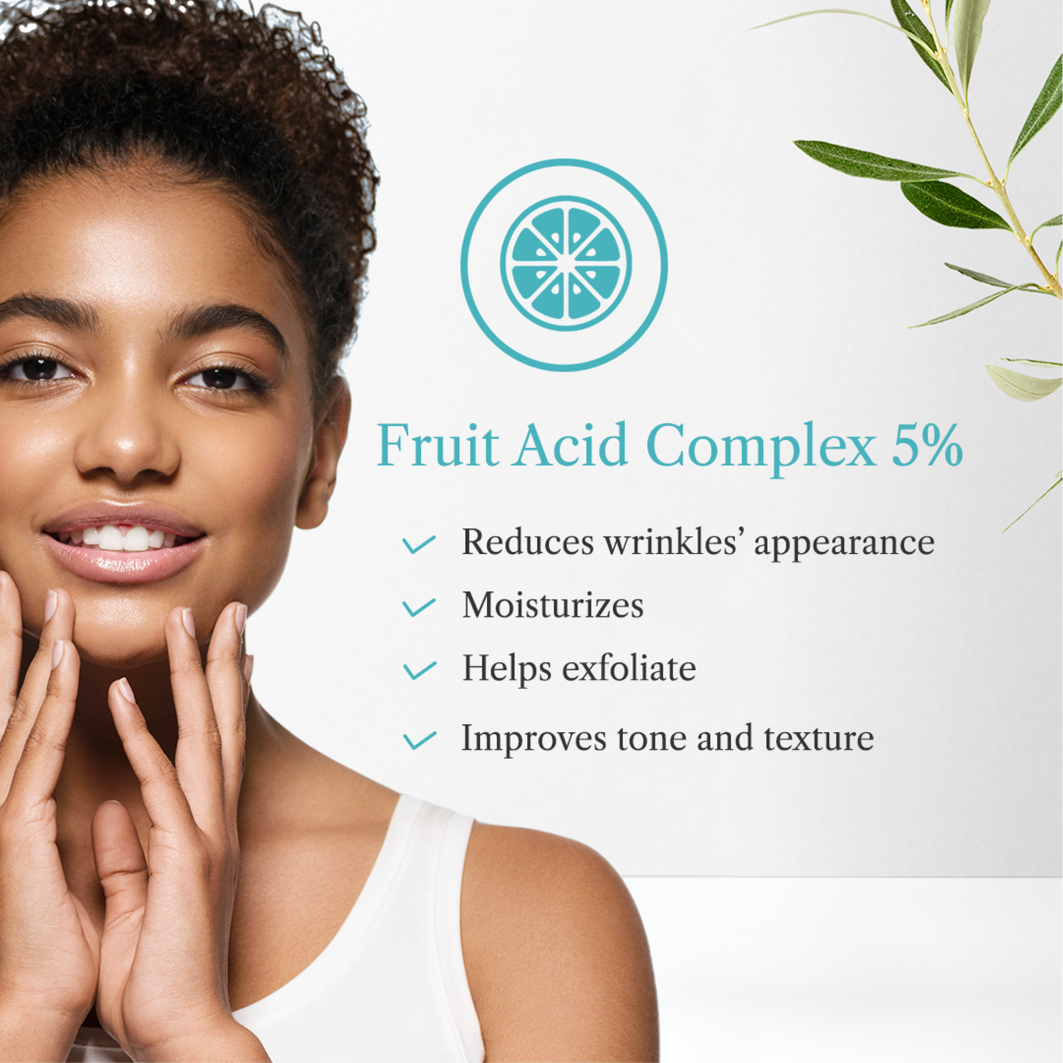 Reduces wrinkles' appearance - Since these five botanical extracts are capable of boosting collagen production, the fruit acid complex helps achieve smooth, wrinkle-free skin.