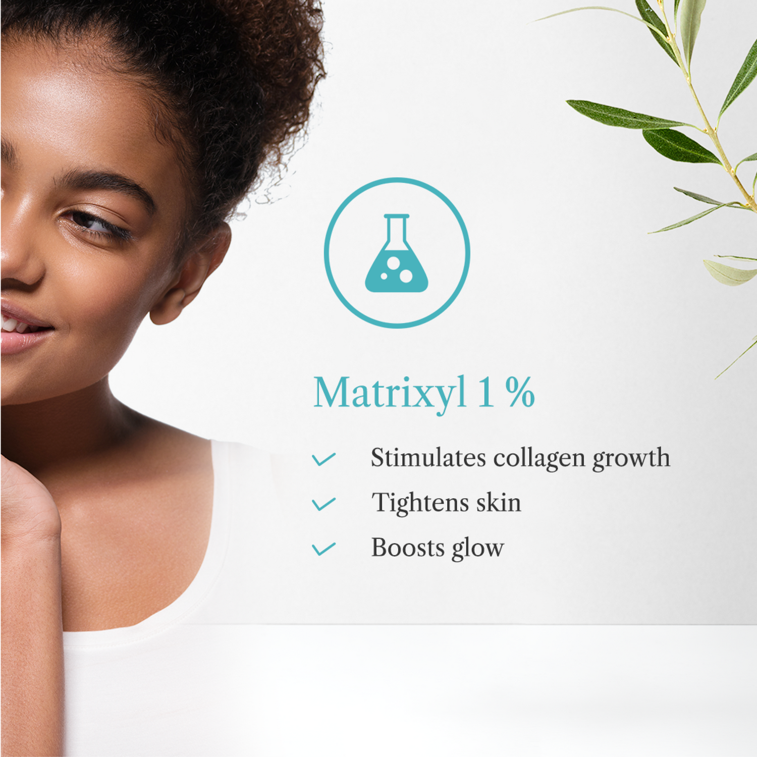 Boosts glow - Matrixyl increases hyaluronic acid production in the body and thus helps with issues such as dry, dull, and dehydrated skin.